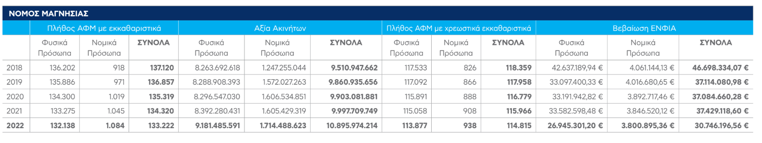 Συγκεντρωτικά στοιχεία από την ΑΑΔΕ παρουσιάζονται επίσης για τη Μαγνησία με το πλήθος των φορολογουμένων του Νομού να ανέρχεται στους 133.222, εκ των οποίων οι 132.138 είναι φυσικά πρόσωπα και οι 1.084 είναι νομικά. Η αξία των ακινήτων και των δύο ομάδων ανέρχεται στα 10.895.974.214 ευρώ, ενώ το συνολικό ποσό που πρέπει να καταβληθεί είναι 30.746.196,56 ευρώ σχετικά με τις δύο ομάδες. Πρέπει να σημειωθεί ότι το ποσό αυτό είναι μικρότερο σε σχέση με την περσινή χρονιά με τη διαφορά μάλιστα να είναι αξιοσημείωτη, καθώς ανέρχεται στο ποσό των 6.682.9221 ευρώ.