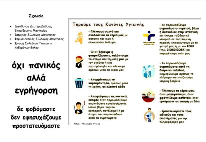 Η Διεύθυνση Δευτεροβάθμιας Εκπαίδευσης, σε συνεργασία με τον Ιατρικό Σύλλογο Μαγνησίας, το Φαρμακευτικό Σύλλογο Μαγνησίας την Ένωση Συλλόγων Γονέων και Κηδεμόνων Βόλου οργανώνει μέσω των σχολικών μονάδων Δευτεροβάθμιας Εκπαίδευσης δράση ενημέρωσης με τίτλο «Όχι Πανικός αλλά Εγρήγορση», με στόχο την πρόληψη και αποτροπή της μετάδοσης της νόσου από τον κορωνοϊό SARS-CoV-2.