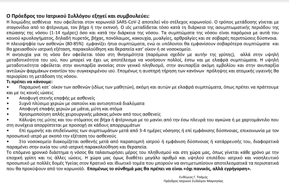 Εντούτοις, επισημαίνεται ότι επειδή το επόμενο χρονικό διάστημα η νόσος θα ταλαιπωρήσει μέρος του πληθυσμού και στη χώρα μας όπως γίνεται κάθε χρόνο με την εποχική γρίπη και τις άλλες ιώσεις, οι πολίτες πρέπει να προβαίνουν στην αυστηρή τήρηση των κανόνων πρόληψης και ατομικής υγιεινής, πρακτική που θα περιορίσει τη μετάδοση της νόσου. Τονίζεται επίσης, ότι η χώρα μας διαθέτει μεγάλο αριθμό και υψηλού επιπέδου ιατρικό και νοσηλευτικό προσωπικό με πολλές δομές Υγείας στον Κρατικό και Ιδιωτικό τομέα που μπορούν να αντιμετωπίσουν αποτελεσματικά τα περιστατικά που θα προκύψουν από τον κορωνοϊό. Έτσι, το σύνθημά μας θα πρέπει να είναι «όχι πανικός, αλλά εγρήγορση».Τέλος, στο τρισέλιδο δίνονται και στοιχεία φορέων και οργανισμών στους οποίους οι πολίτες μπορούν να ανατρέξουν για περισσότερες πληροφορίες.