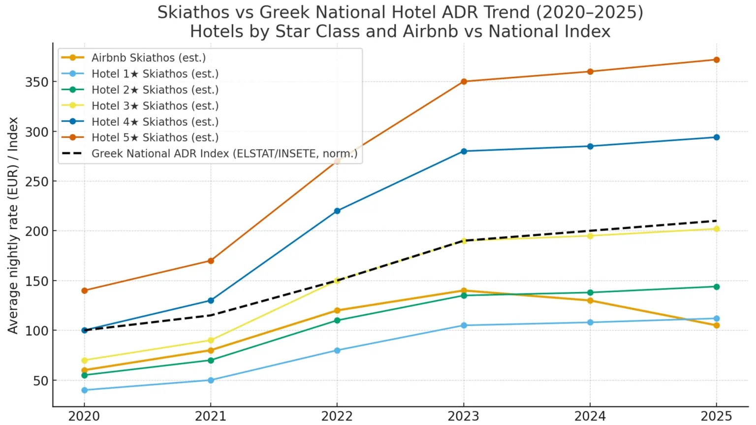 Το δεύτερο συγκρίνει τις τιμές των ξενοδοχείων ανά κατηγορία με τον Πανελλήνιο μέσο όρο αλλά και με τα καταλύματα βραχυχρόνιας μίσθωσης στη Σκιάθο.