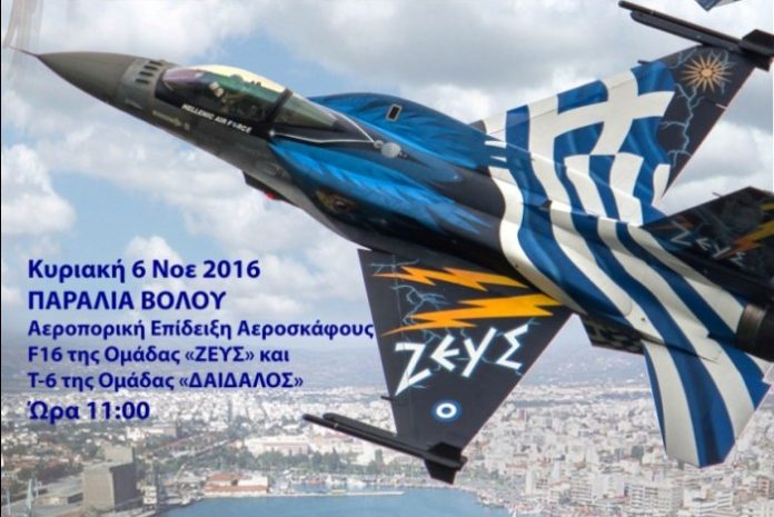 Το πρόγραμμα της αεροπορικής επίδειξης στην παραλία του Βόλου που αναμένεται να κατακλυστεί από θεατές και φίλους της αεροπορικής ιδέας, περιλαμβάνει αρχικά επίδειξη αεροσκάφους Τ-6 της ομάδας «Δαίδαλος» και στη συνέχεια επίδειξη του F-16 της ομάδας «Ζευς».