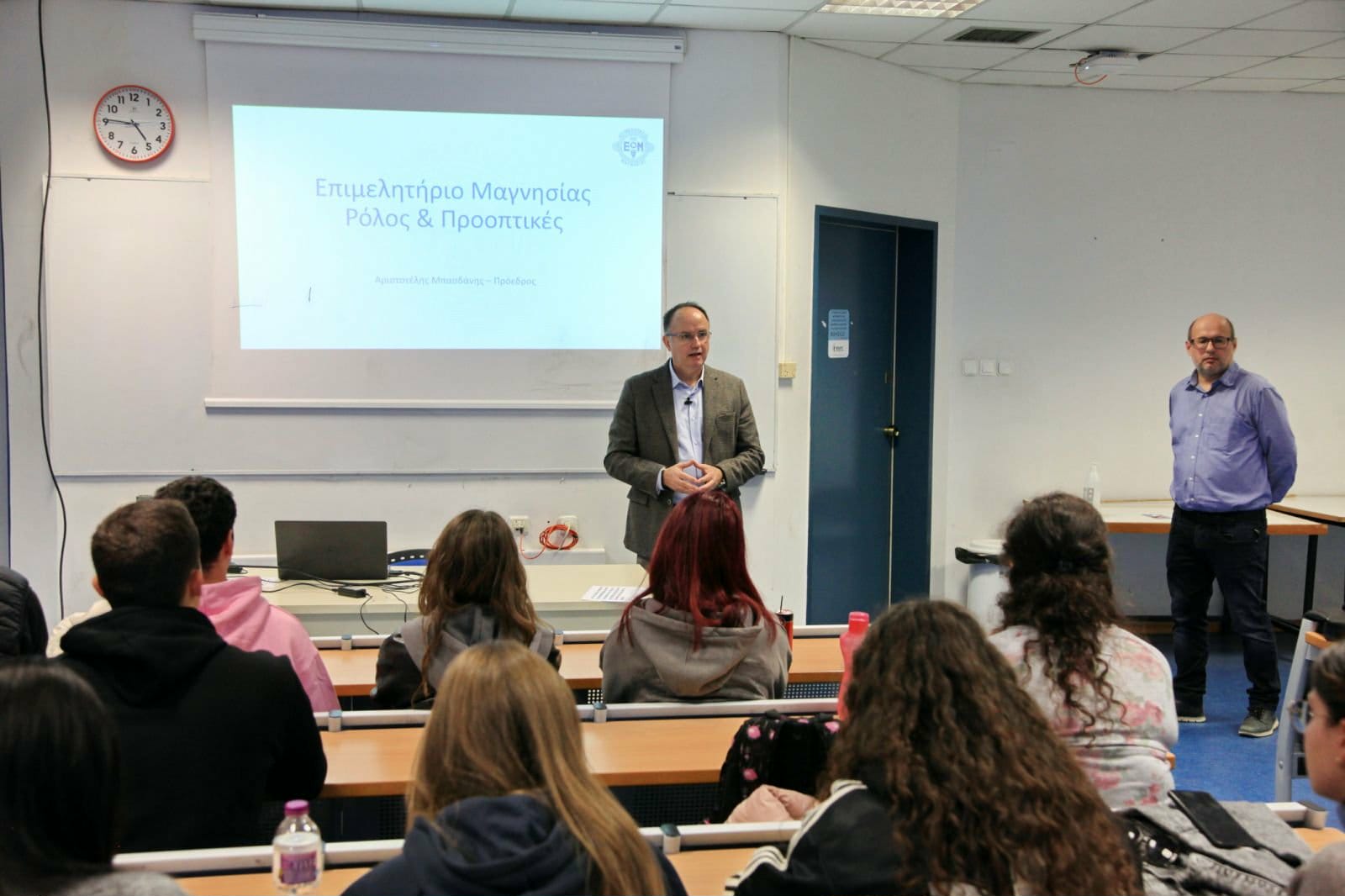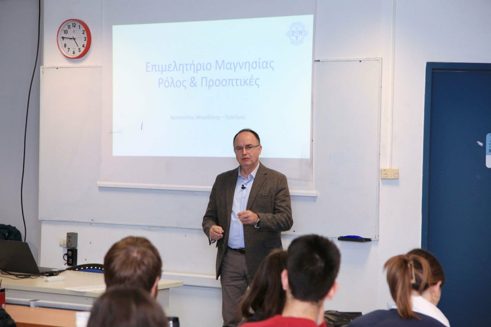 Για τη λειτουργία του επιμελητηριακού θεσμού στη χώρα, το νομικό καθεστώς που διέπει το ΝΠΔΔ, τον ρόλο των Ευρωεπιμελητηρίων και του Επιμελητηριακού Ομίλου Ανάπτυξης Ελληνικών Νησιών, τον κοινωνικό χαρακτήρα του Επιμελητηρίου Μαγνησίας, αλλά και για τη συμβολή του στη στήριξη και την εξωστρέφεια της τοπικής επιχειρηματικότητας μίλησε το πρωί της Δευτέρας 1 Δεκεμβρίου ο πρόεδρος του Επιμελητηρίου Μαγνησίας Αριστοτέλης Μπασδάνης στους πρωτοετείς φοιτητές του Τμήματος Μηχανικών Χωροταξίας, Πολεοδομίας και Περιφερειακής Ανάπτυξης του Πανεπιστημίου Θεσσαλίας, όπως κάνει γνωστό με ανακοίνωση, που εξέδωσε το Επιμελητήριο Μαγνησίας.