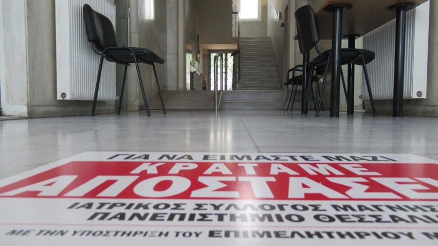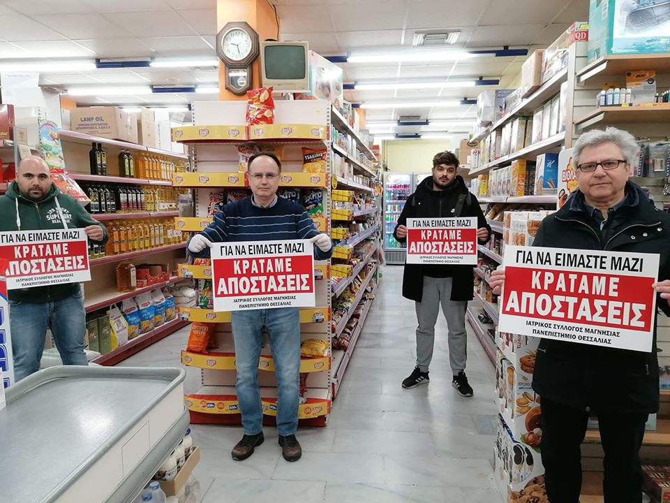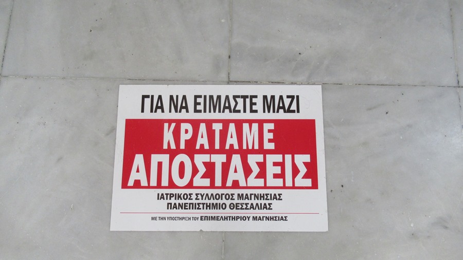 Το σύνθημα είναι «Για να είμαστε μαζί, κρατάμε αποστάσεις» και δημιουργήθηκε μετά από πρωτοβουλία του Πανεπιστημίου Θεσσαλίας και του Ιατρικού Συλλόγου Μαγνησίας σε συνεργασία με το Επιμελητήριο Μαγνησίας, όπου το σχετικό αυτοκόλλητο διατέθηκε σε πολλές επιχειρήσεις στις αρχές Απριλίου.