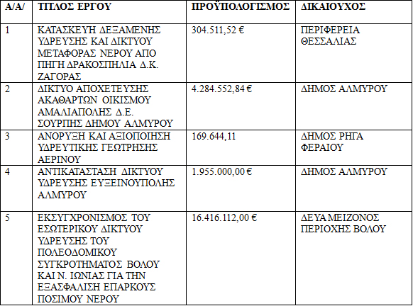 Τα έργα που αφορούν το νομό Μαγνησίας είναι τα εξής: