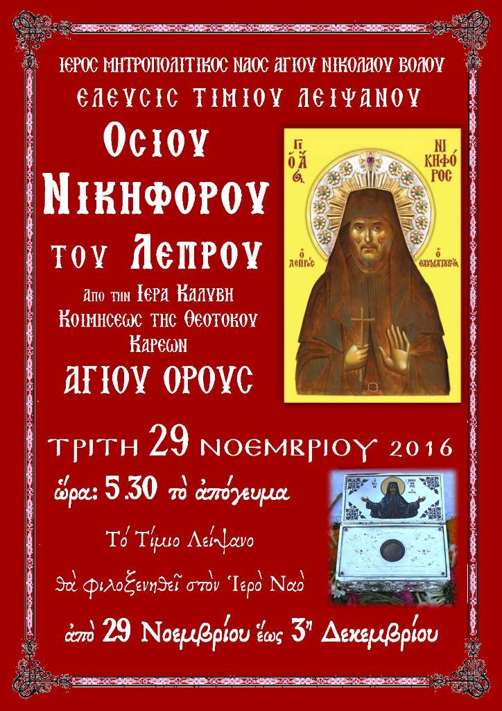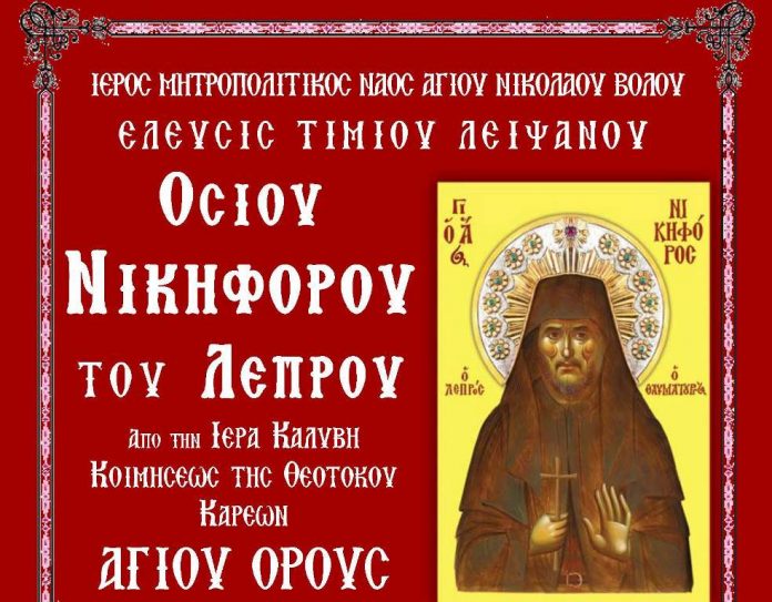 «Ξεχωριστή ευλογία για την Τοπική μας Εκκλησία αποτελεί η φιλοξενία στον Μητροπολιτικό Ιερό Ναό Αγίου Νικολάου Βόλου του Τιμίου Λειψάνου του νεοφανούς Οσίου Νικηφόρου του Λεπρού και Θαυματουργού», όπως αναφέρεται από την Μητρόπολη.