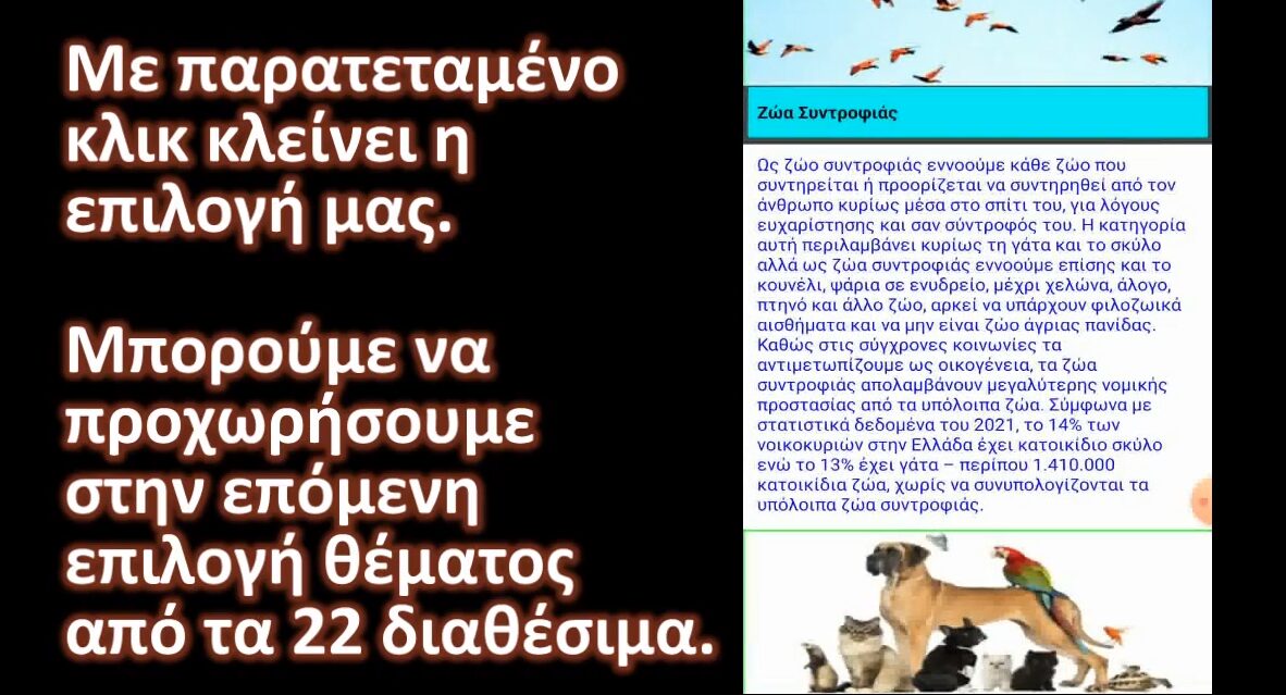 Η ομάδα των μαθητών Βανέσας Κότσι, Γιώργου Μακρή και Ασπασίας Καλαντζή με αφορμή την υιοθεσία ζώων αποφάσισε να συγκεντρώσει το νομικό πλαίσιο γύρω από τα κατοικίδια και να το παρουσιάσει με έναν εύκολο και προσιτό τρόπο στην κοινωνία. Έτσι, δημιούργησε την εφαρμογή “filozoia”. Σε αυτή έχουν συγκεντρωθεί όλες οι διατάξεις που σχετίζονται με τη συμβίωση των ανθρώπων με τα κατοικίδια.