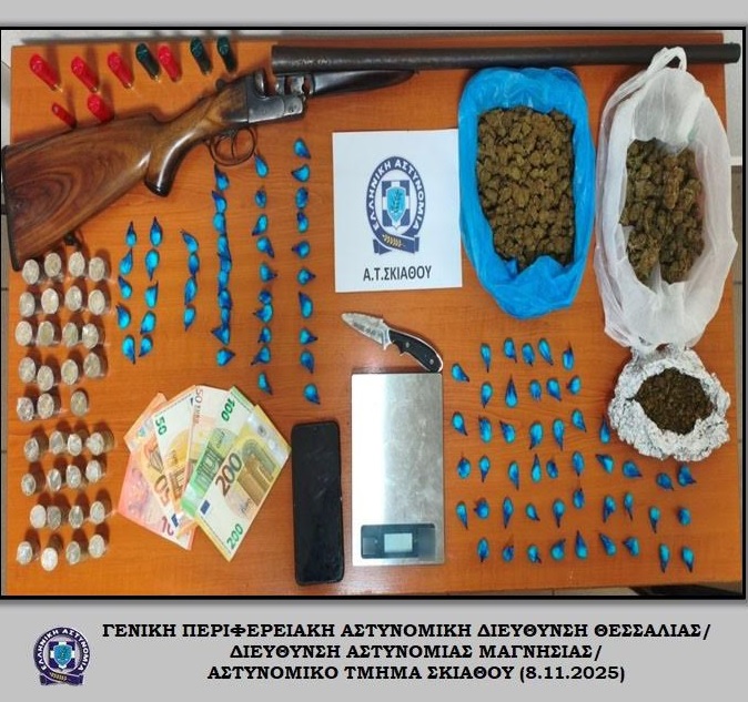 Συνελήφθη, χθες (7-11-2025) το μεσημέρι στην Σκιάθο, από αστυνομικούς του Αστυνομικού Τμήματος Σκιάθου, ένας 36χρονος ημεδαπός άνδρας, σε βάρος του οποίου σχηματίστηκε δικογραφία για παράβαση της νομοθεσίας περί ναρκωτικών και της νομοθεσίας περί όπλων.