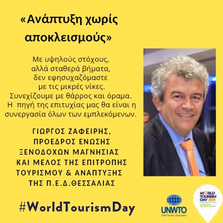Μήνυμα για την Παγκόσμια Ημέρα Τουρισμού, που γιορτάζεται κάθε χρόνο στις 27 Σεπτεμβρίου και φέτος είναι αφιερωμένη στην χωρίς αποκλεισμούς ανάκαμψη και ανάπτυξη («Tourism for Inclusive Growth»), απέστειλε ο Γιώργος Ζαφείρης πρόεδρος της Ένωσης Ξενοδόχων Μαγνησίας και μέλος της επιτροπής τουρισμού και ανάπτυξης της ΠΕΔ.