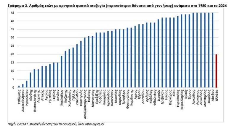 Η διαφορά δε ανάμεσα στις ακραίες περιπτώσεις είναι συνταρακτική: σε 6 νομούς (Αρκαδία, Λακωνία, Λευκάδα, Μεσσηνία, Φωκίδα και Λέσβο) καταγράφονται περισσότεροι θάνατοι από γεννήσεις για όλη την εξεταζόμενη περίοδο (για 45 συνεχή χρόνια) ενώ στο Ρέθυμνο για ένα μόνον έτος.