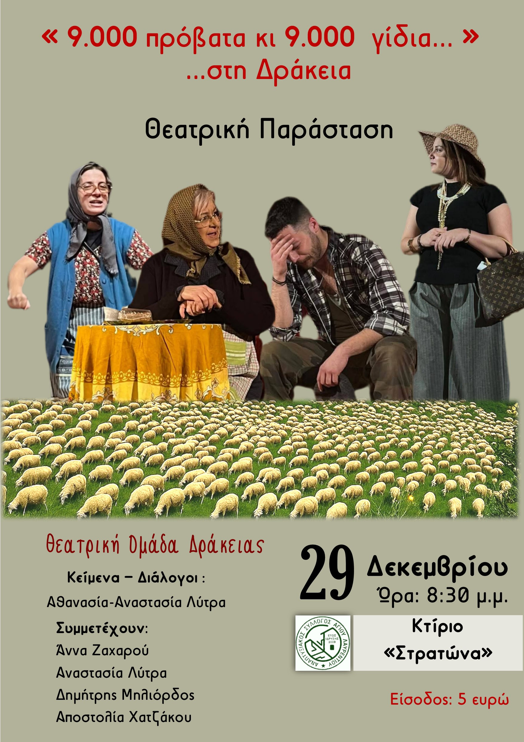 29 Δεκεμβρίου στις 20:30: Ο μικρός θίασος της Δράκειας παρουσιάζει το έργο με τίτλο: “9.000 πρόβατα κι 9.000 γίδια… στη Δράκεια”.