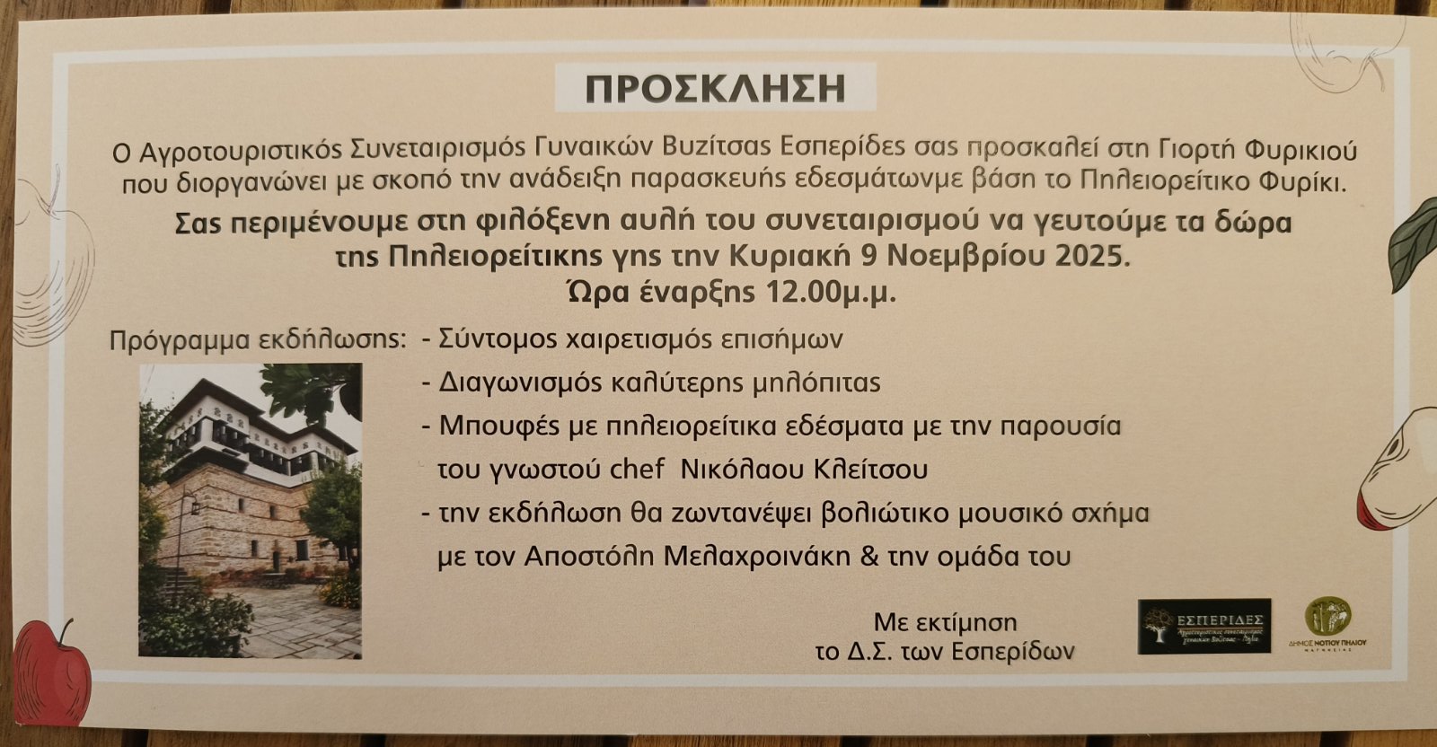 Ο Αγροτουριστικός Συνεταιρισμός Γυναικών Βυζίτσας «Εσπερίδες» διοργανώνει τη Γιορτή Φυρικιού, με σκοπό την ανάδειξη παρασκευής εδεσμάτων με βάση το Πηλειορείτικο Φυρίκι. Η γιορτή θα διεξαχθεί στην αυλή του συνεταιρισμού την Κυριακή 9 Νοεμβρίου στις 12:00μ.μ..