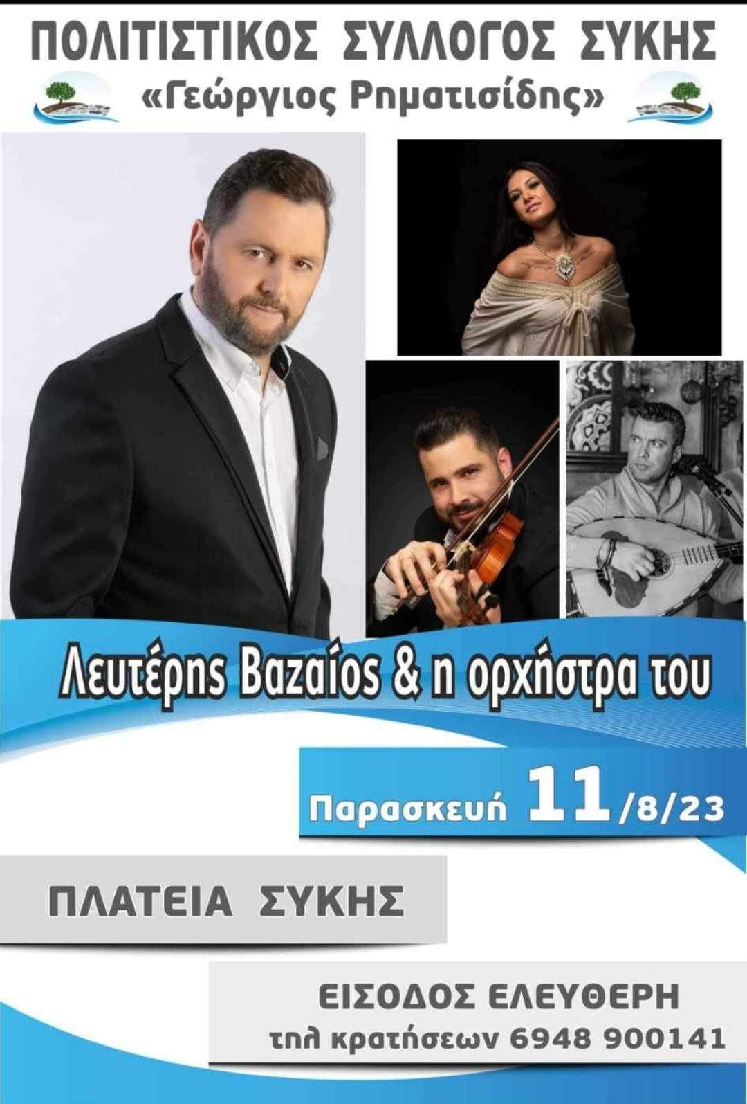 Λαϊκό γλέντι διοργανώνει ο Πολιτιστικός Σύλλογος Συκής «Γεώργιος Ρηματισίδης» αύριο Παρασκευή 11 Αυγούστου στην πλατεία της Συκής με τον Λευτέρη Βαζαίο και την ορχήστρα του. Η είσοδος είναι ελεύθερη. Τηλ. Κρατήσεων 6948900141.