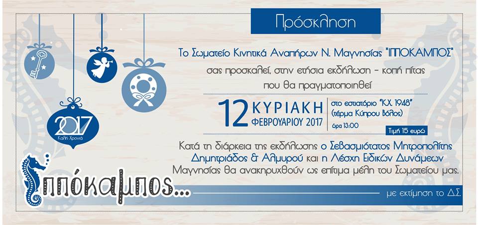 Το Σωματείο Κινητικά Αναπήρων Ν. Μαγνησίας «ΙΠΠΟΚΑΜΠΟΣ» σας προσκαλεί, στην ετήσια εκδήλωση – κοπή πίτας που θα πραγματοποιηθεί την Κυριακή 12 Φεβρουαρίου 2017 και ώρα 13:00 στο εστιατόριο “Κ.Χ. 1948” (τέρμα Κύπρου Βόλος).