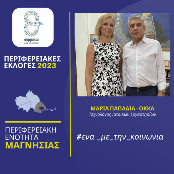 Την Τεχνολόγο Ιατρικών Εργαστηρίων Μαρία Παπαδιά – Όκκα, που κατέρχεται υποψήφια περιφερειακή σύμβουλος στην Π.Ε. Μαγνησίας στις αυτοδιοικητικές εκλογές του Οκτωβρίου, καλωσόρισε ο Περιφερειάρχης Θεσσαλίας Κώστας Αγοραστός στον συνδυασμό «Συμμαχία υπέρ των πολιτών» που έχει σταθερά στο επίκεντρο τον άνθρωπο, αγωνίζεται με έργα, δράσεις, πρωτοβουλίες για μια Περιφέρεια χωρίς διακρίσεις και αποκλεισμούς.