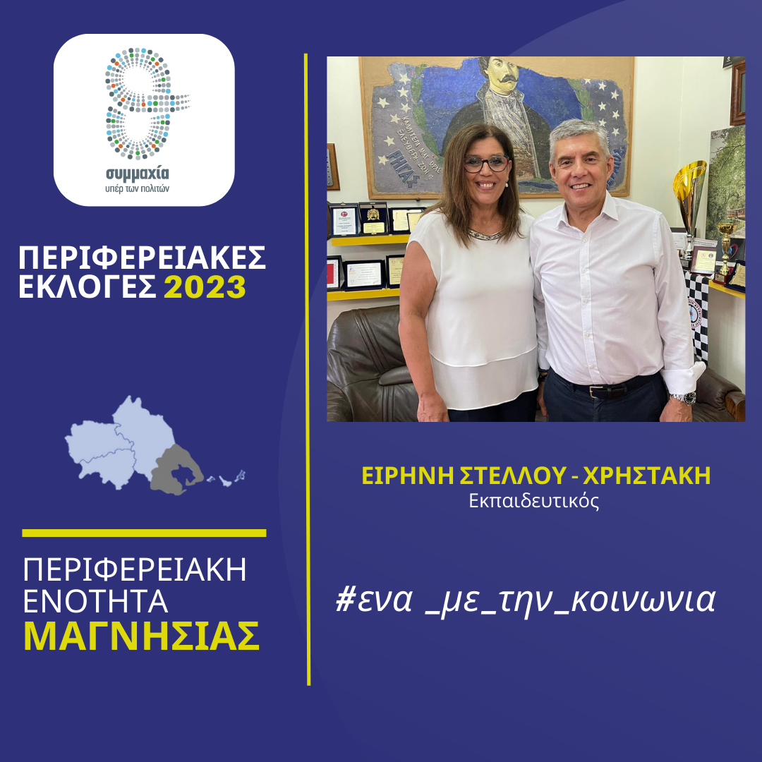 Την εκπαιδευτικό Ειρήνη Στέλλου – Χρηστάκη που κατέρχεται υποψήφια περιφερειακή σύμβουλος στην Π.Ε. Μαγνησίας στις αυτοδιοικητικές εκλογές του Οκτωβρίου, καλωσόρισε ο Περιφερειάρχης Θεσσαλίας Κώστας Αγοραστός στον συνδυασμό «Συμμαχία υπέρ των πολιτών» που έχει σταθερά στο επίκεντρο τον άνθρωπο και αγωνίζεται με έργα, δράσεις, πρωτοβουλίες για μια Περιφέρεια χωρίς διακρίσεις και αποκλεισμούς.