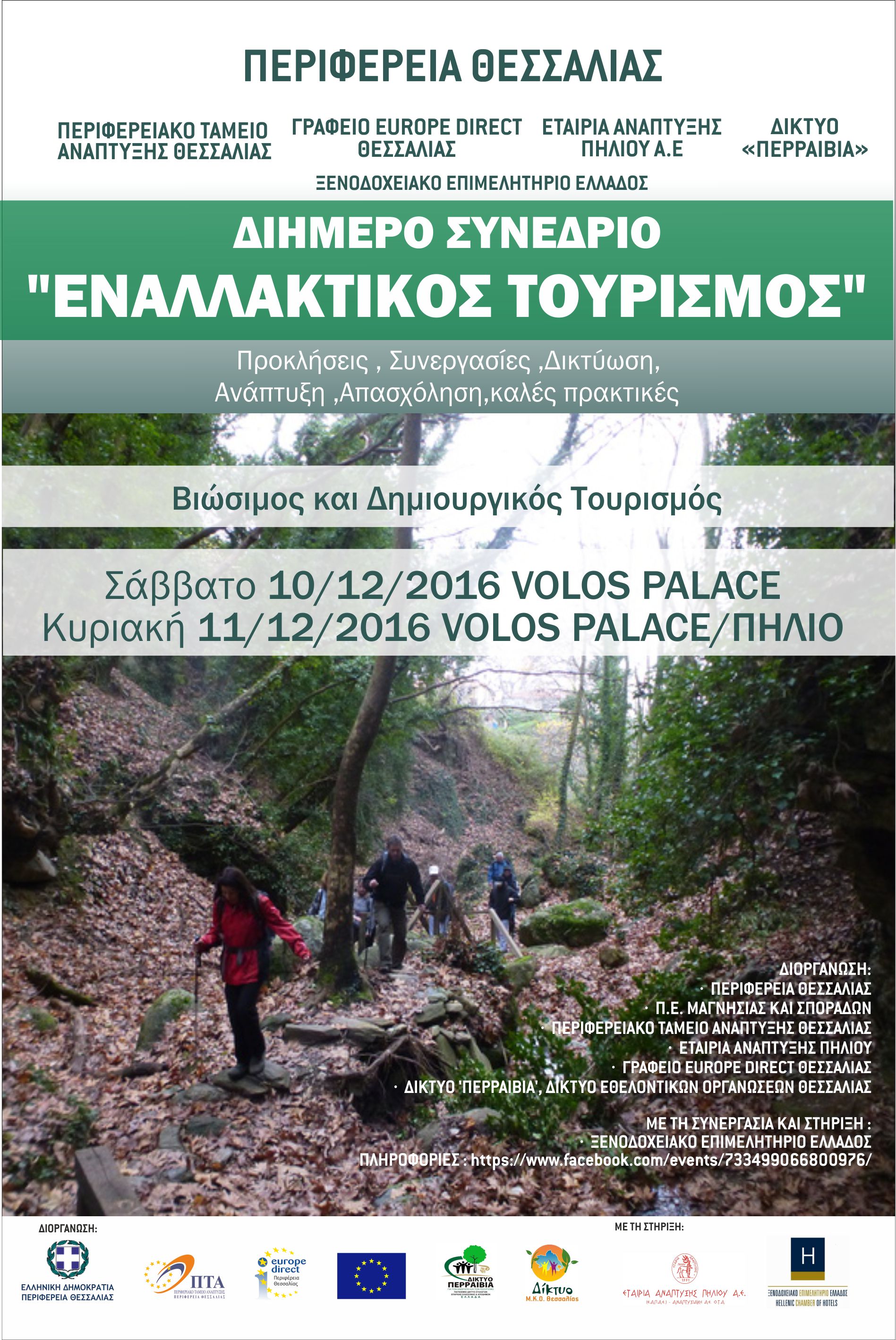 στο Βόλο, το Σάββατο 10 και την Κυριακή 11 Δεκεμβρίου 2016, στο Ξενοδοχείο VOLOS PALACE και στο Πήλιο , με τίτλο: «ΕΝΑΛΛΑΚΤΙΚΟΣ ΤΟΥΡΙΣΜΟΣ: Ευκαιρίες, Προκλήσεις ,Συνεργασίες , Ανάπτυξη»