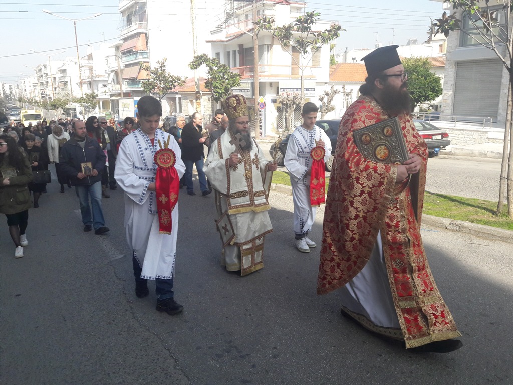 Εν συνεχεία πραγματοποιήθηκε λιτάνευσις των Ιερών Εικόνων επί των Οδών Αναλήψεως, Λόρδου Βύρωνος και Καραϊσκάκη, και επιστρέφοντας στον Ναό του Τιμίου Προδρόμου, αναγνώστηκε το Συνοδικό της ημέρας από τον Σεβασμιώτατο Ποιμενάρχη μας.
