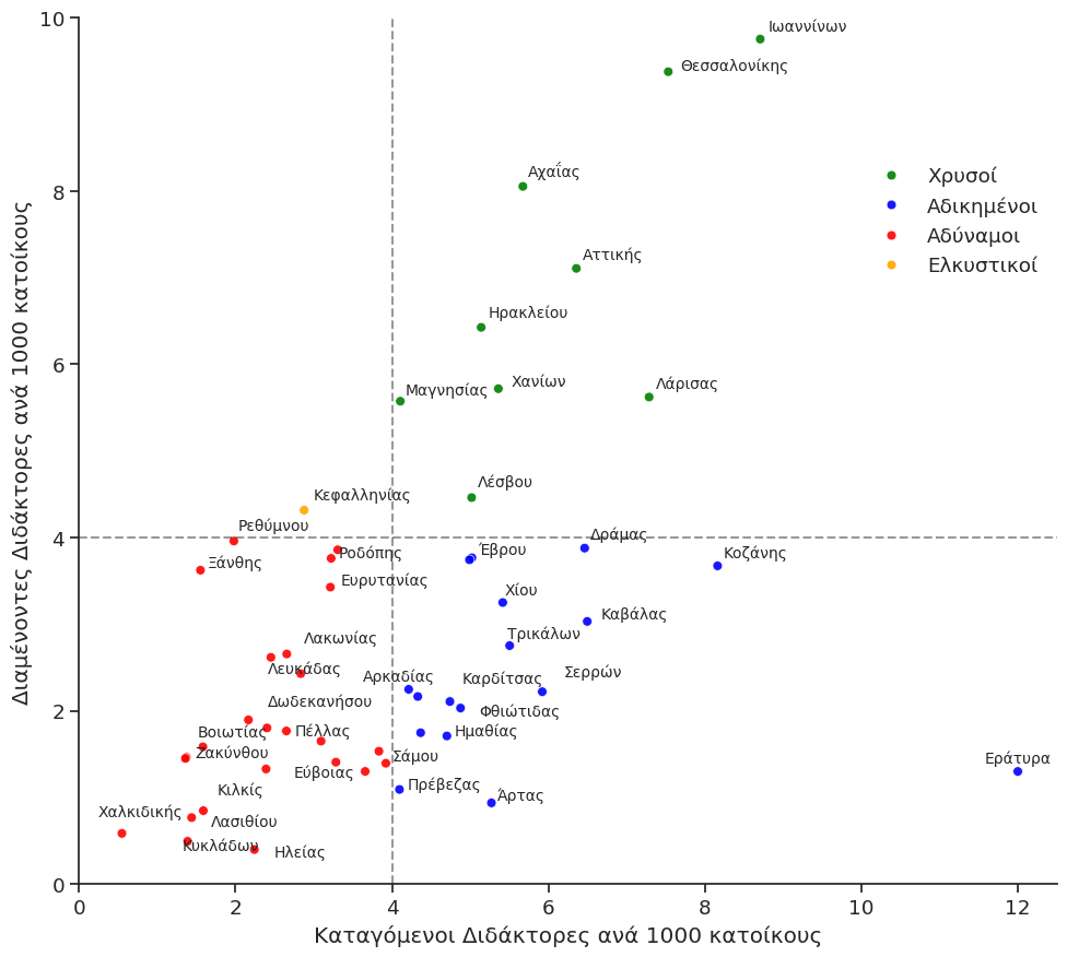 Τέλος, όλως περιέργως, όπως χαρακτηριστικά αναφέρει ο κ. Πήτας, υπάρχει αρνητική συσχέτιση ανάμεσα στην «γέννηση» διδακτόρων και το ανά κεφαλήν διαθέσιμο εισόδημα στις διάφορες Περιφέρειες της χώρας. Δηλαδή, ο πλούτος δεν οδηγεί οπωσδήποτε στην μόρφωση υψηλού επιπέδου.