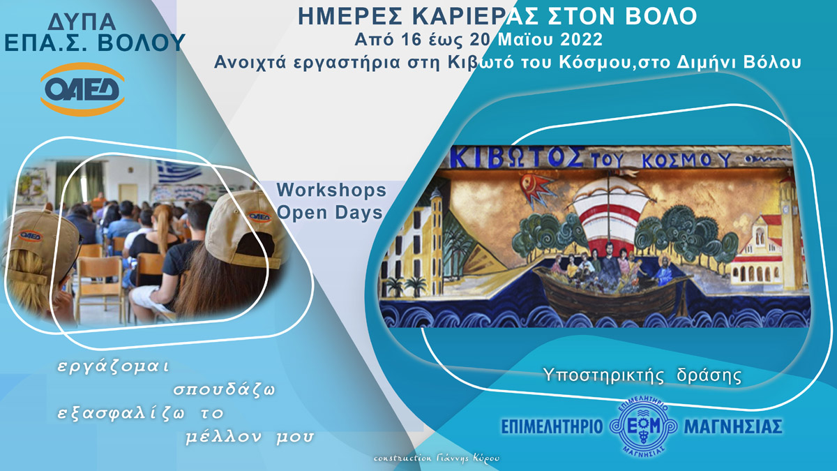 Ημέρες Καριέρας μεταξύ 16 έως 20 Μαΐου διοργανώνει η Δ.Υ.Π.Α ΕΠΑΣ Βόλου (πρώην ΟΑΕΔ), στο πλαίσιο της ευρωπαϊκής εβδομάδας επαγγελματικών δεξιοτήτων. Η δράση πραγματοποιείται με την στήριξη του Επιμελητηρίου Μαγνησίας, και σε συνεργασία με την Κιβωτό του Κόσμου.