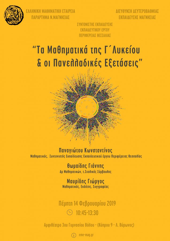 Η Ελληνική Μαθηματική Εταιρεία-Παράρτημα Ν. Μαγνησίας στο πλαίσιο των εκπαιδευτικών- επιμορφωτικών της δράσεων διοργανώνει ημερίδα με θέμα: «Τα Μαθηματικά της Γ ́ Λυκείου & οι Πανελλαδικές Εξετάσεις» που θα πραγματοποιηθεί την Πέμπτη 14 Φεβρουαρίου από 10:45-13:30 στο Αμφιθέατρο του σχολικού συγκροτήματος του 3ου Γυμνασίου-3ου Λυκείου Βόλου. Απευθύνεται σε μαθητές της Γ’ Λυκείου καθώς και σε μαθηματικούς.
