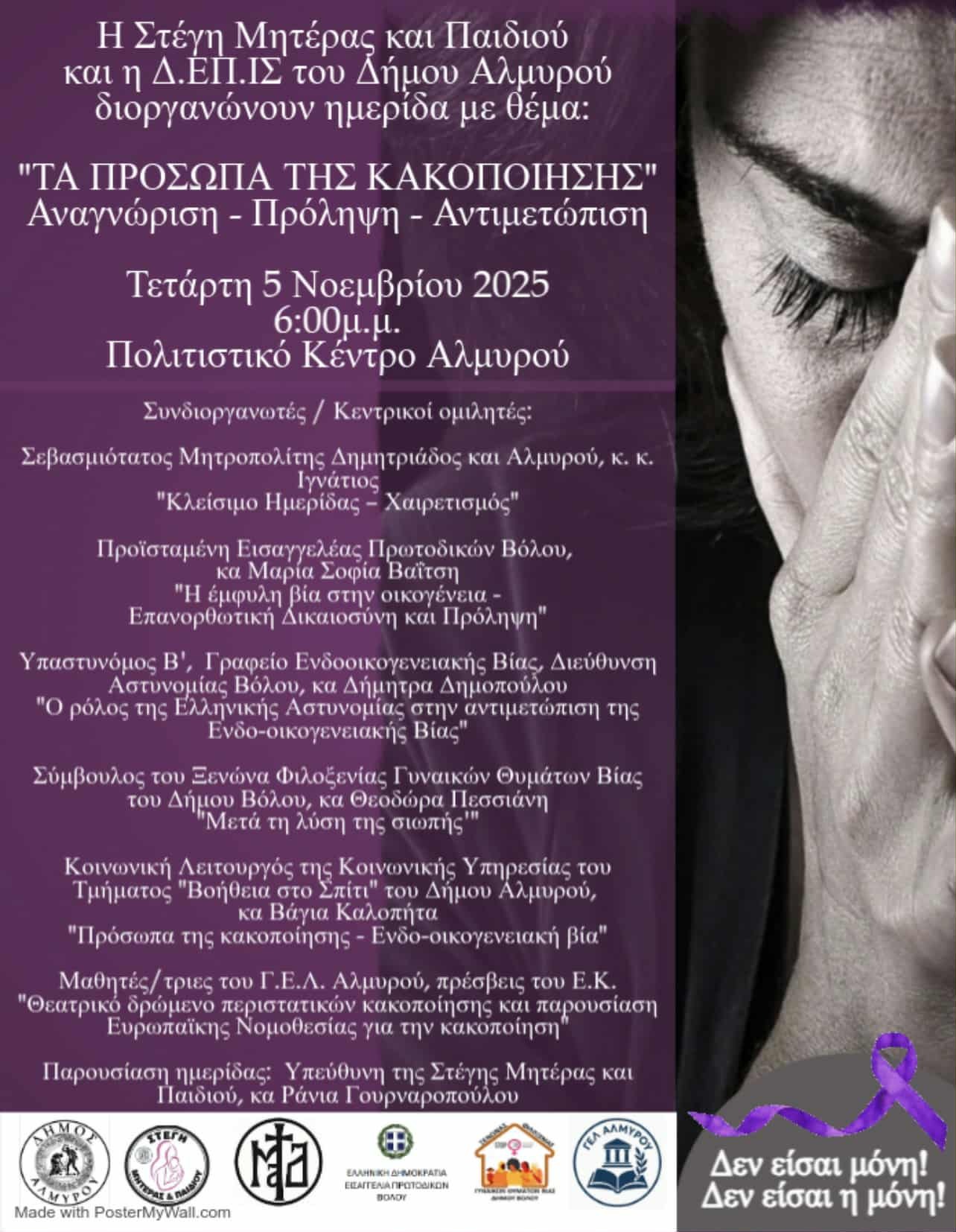 Η Στέγη Μητέρας και Παιδιού και η Δημοτική Επιτροπή Ισότητας του Δήμου Αλμυρού, διοργανώνουν ημερίδα με θέμα: «Τα πρόσωπα της κακοποίησης – Αναγνώριση / Πρόληψη και Αντιμετώπιση» την Τετάρτη 5 Νοεμβρίου 2025 στις 6 το απόγευμα στο Πολιτιστικό Κέντρο Αλμυρού.