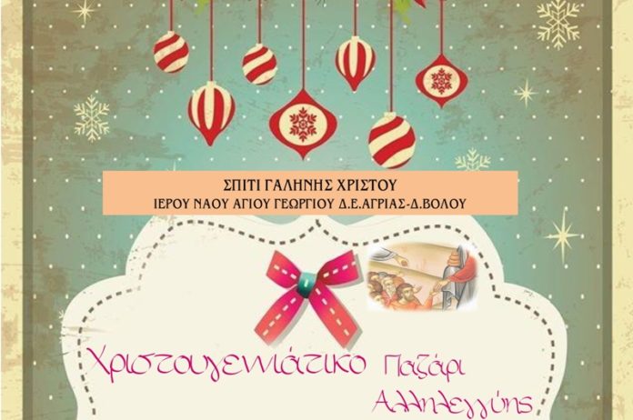 Το Δ.Σ. του Σπιτιού Γαλήνης του Ιερού Ναού Αγίου Γεωργίου Αγριάς προσκαλεί την Κυριακή 26 Νοεμβρίου από 10.30 π.μ. έως 10μ.μ. στην έναρξη του “Χριστουγεννιάτικου Bazzar Αλληλεγγύης” στην αίθουσα του Ενοριακού Πνευματικού Κέντρου. “Θα έχετε την ευκαιρία, μέσα σε μια γιορτινή ατμόσφαιρα γεμάτη εκπλήξεις, να διαλέξετε Χριστουγεννιάτικα δώρα, σπιτικά γλυκά και λιχουδιές, χειροποίητες κατασκευές όλα φτιαγμένα με μεράκι και αγάπη”.