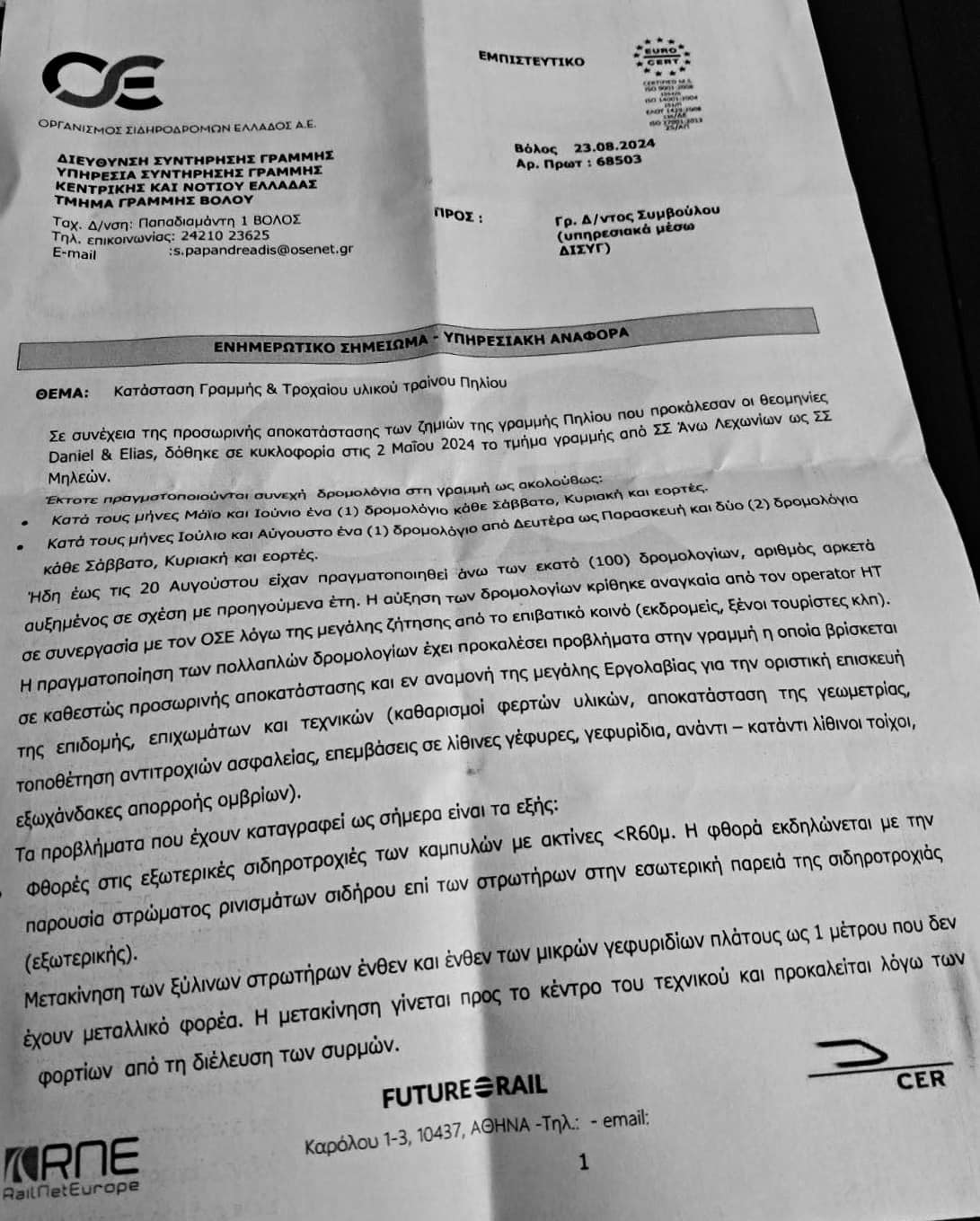 23 Αυγούστου 2024 με εμπιστευτικό υπηρεσιακό έγγραφο η Υπηρεσία Συντήρησης Γραμμής – Τμήμα Γραμμής ΟΣΕ Βόλου, ενημερώνει τον Διευθύνοντα Σύμβουλο του ΟΣΕ για: Σοβαρά προβλήματα των σιδηροτροχιών, φθορές στις επιβατάμαξες που δε διαθέτουν, λόγω παλαιότητας, σύγχρονες προδιαγραφές ασφαλείας.