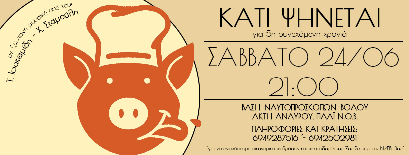 Τα «Λυκόπουλα» οι «Πρόσκοποι», οι «Ανιχνευτές», το «Προσκοπικό Δίκτυο» και η «Επιτροπή Κοινωνικής Συμπαράστασης» του 7ου Συστήματος Ναυτοπροσκόπων Βόλου, προσκαλούν τους γονείς τα μέλη και τους φίλους του Συστήματος στο ετήσιο BBQ “κάτι ψήνεται” που διοργανώνεται για 5η συνεχή χρονιά με σκοπό την στήριξη του Συστήματος.