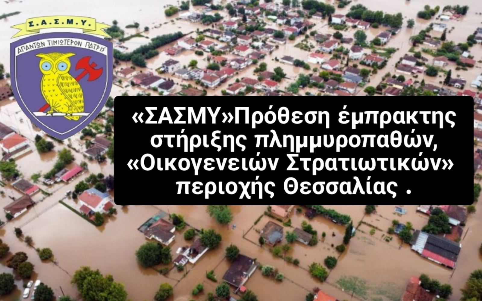 Παρακαλούνται όσες οικογένειες στρατιωτικών κατοικούν στην περιοχή Θεσσαλίας και υπέστησαν φθορές στην οικοσκευή τους, ανεξάρτητα εάν είναι μέλη του συνδέσμου, βαθμού και προέλευσης, να επικοινωνήσουν με τον πρόεδρο ή τον γραμματέα του ΣΑΣΜΥ τηλεφωνικά είτε με email αποστέλλοντας τα στοιχεία τους ώστε να καταστεί δυνατή η παροχή βοήθειας.
