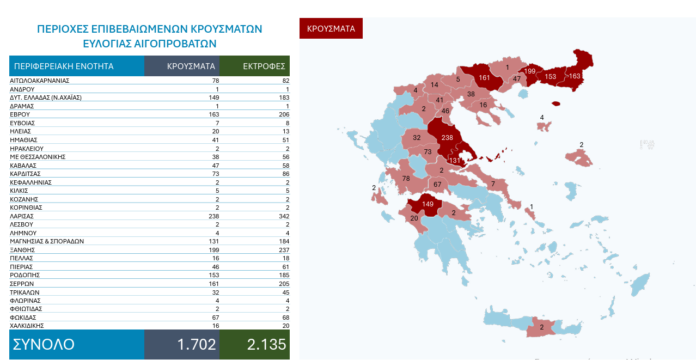 Συνολικά και πανελλαδικά, όπως ανακοινώθηκε έχουν καταγραφεί 1.702 επιβεβαιωμένα κρούσματα ευλογιάς αιγοπροβάτων σε 2.135 εκτροφές, ενώ έχουν θανατωθεί 417.365 αιγοπρόβατα.