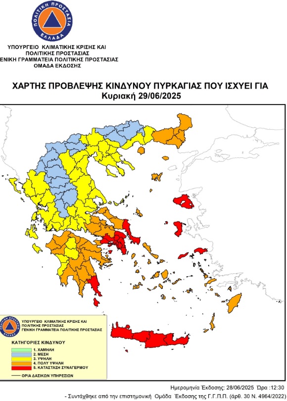 Από το γραφείο της Αντιπεριφερειάχη Μαγνησίας, Άννα Μαρία Παπαδημητρίου, γίνεται γνωστό ότι σύμφωνα: με τον Χάρτη Πρόβλεψης Κινδύνου Πυρκαγιάς της Γ.Γ.Π.Π. και συγκεκριμένα κατηγορία 3 (υψηλή) για την Π.Ε. Μαγνησίας & Σποράδων, που ισχύει για σήμερα Κυριακή 29-06-2025,
