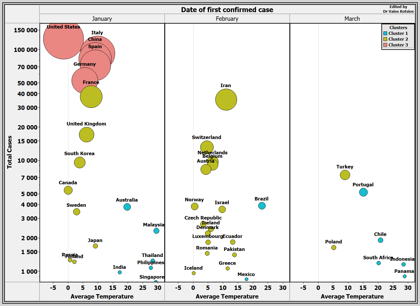 Ενδεικτικά, σε γράφημα, που επισυνάπτεται, οι χώρες διακρίνονται σε 3 ομάδες ανάλογα με τον αριθμό κρουσμάτων τους και τη μέση θερμοκρασία τους την περίοδο της πανδημίας (cluster 1 -μπλε κύκλοι: χώρες με υψηλότερη θερμοκρασία και λιγότερα κρούσματα, cluster 2 -κίτρινοι κύκλοι): χώρες με χαμηλότερη θερμοκρασία και περισσότερα κρούσματα, cluster 3 -κόκκινοι κύκλοι): χώρες με χαμηλότερη θερμοκρασία και >50.000 κρούσματα). Επίσης έγινε ομαδοποίηση των χωρών ανάλογα με την περίοδο εμφάνισης του πρώτου κρούσματος (Ιανουάριος, Φεβρουάριος ή Μάρτιος).