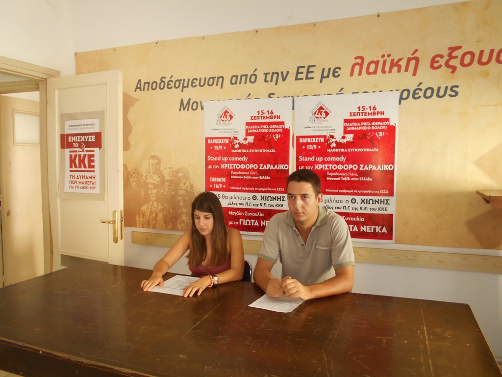 Σε συνέντευξη Τύπου που δόθηκε σήμερα τα μέλη της ΚΝΕ Μαγνησίας Εύη Ξεκαλάκη και Γιάννης Μπράτσος, απηύθυναν κάλεσμα για συμμετοχή στις εκδηλώσεις του Φεστιβάλ, με κεντρικό ομιλητή τον Θοδωρή Χιώνη μέλος του Π.Γ. της Κ.Ε. του ΚΚΕ.