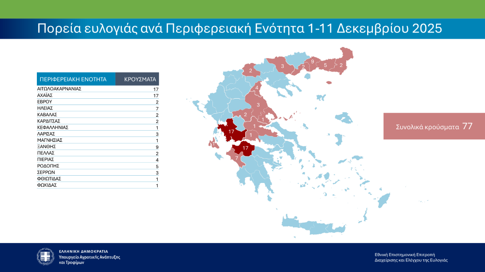 Σύμφωνα με τα όσα έγιναν γνωστά από τον Αύγουστο του 2024 έως και τις 11 Δεκεμβρίου του τρέχοντος έτους καταγράφηκαν σε επίπεδο Νομού συνολικά 136 κρούσματα σε 189 εκτροφές, με το πρόβλημα να εξακολουθεί να παραμένει αν και σε χαμηλότερη ένταση.