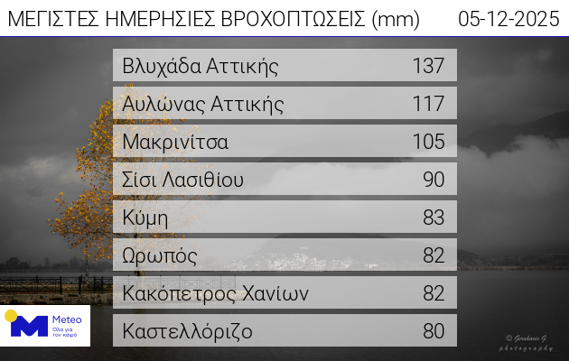 Στις λίστες του Meteo με τις περιοχές που δέχτηκαν τα μεγαλύτερα ύψη βροχής είναι ο Ξάνεμος Σκιάθου, αλλά και η Μακρινίτσα. Σύμφωνα με τα στοιχεία η Μακρινίτσα δέχτηκε 105 χιλιοστά βροχής, ενώ ο Ξάνεμος στη Σκιάθο 75,6 χιλιοστά.