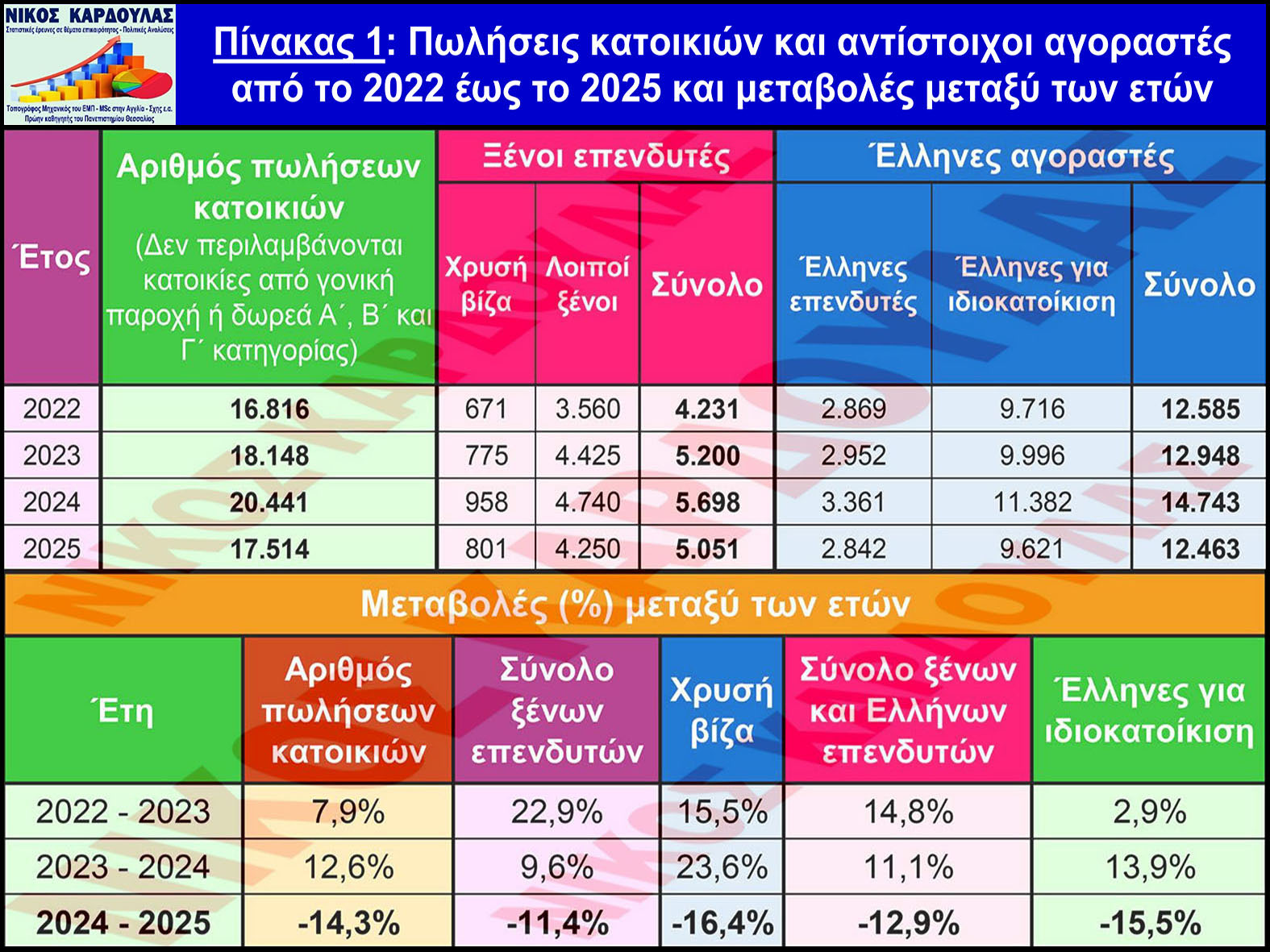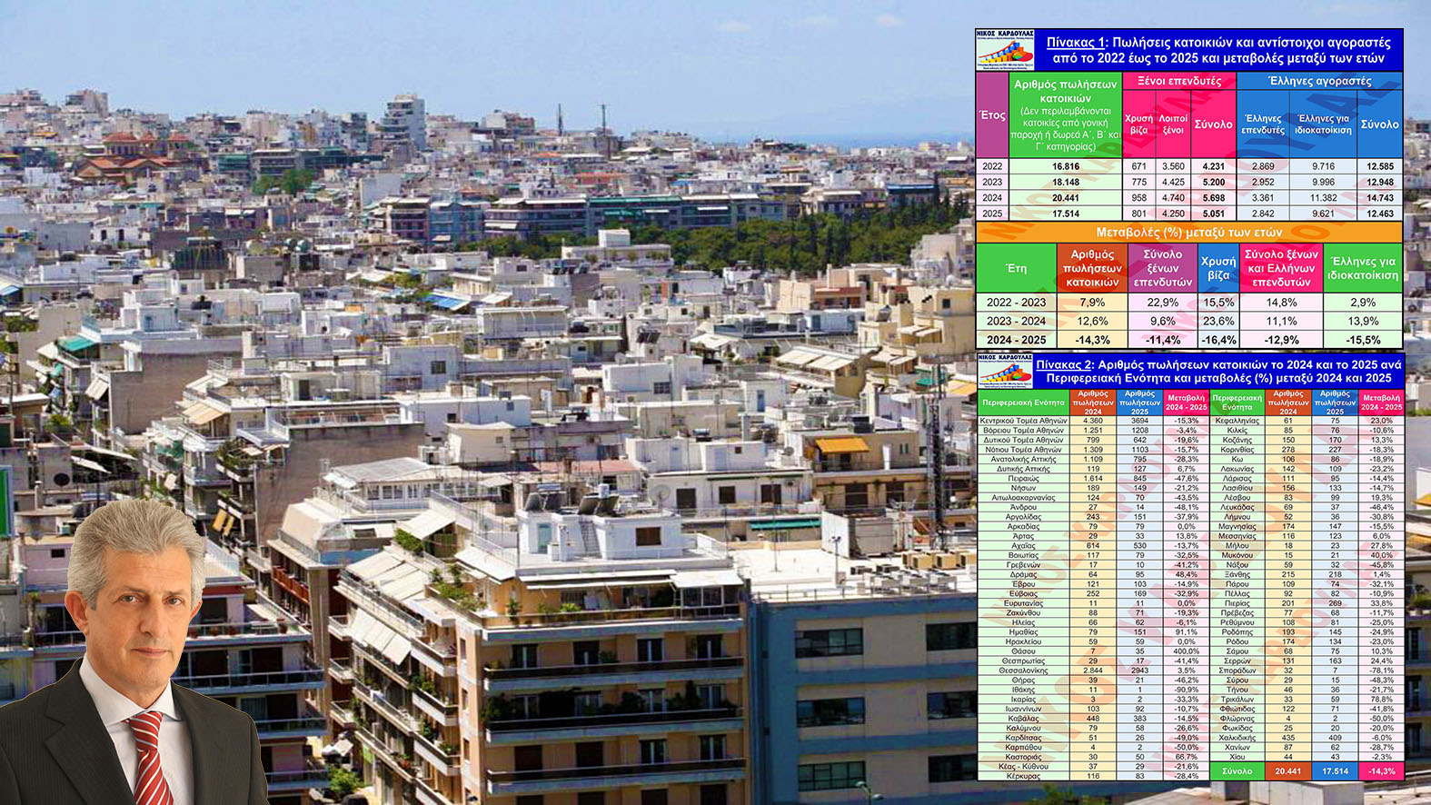 Από τα στοιχεία του φαίνεται ότι το 2022 ο αριθμός των πωλήσεων κατοικιών ανήλθε στις 16816 κατοικίες, το 2024 στις 20441 και το 2025 στις 17514, εκ των οποίων οι 5051 κατοικίες αφορούν ξένους επενδυτές και οι 12 463 Έλληνες αγοραστές.