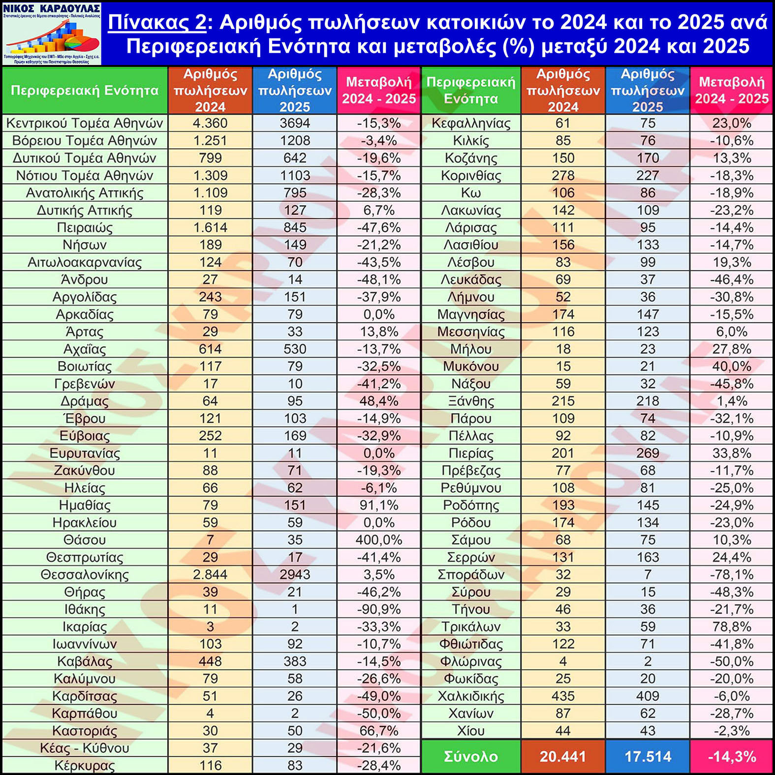 Παράλληλα, ο κ. Καρδούλας συγκέντρωσε τους αριθμούς πωλήσεων κατοικιών ανά ΠΕ για το 2024 και το 2025, στις οποίες δεν περιλαμβάνονται οι κατοικίες από γονική παροχή ή δωρεά Α΄, Β΄ και Γ΄ κατηγορίας και η σχετική μεταβολή (%) μεταξύ των δύο ετών για όλες τις ΠΕ της χώρας.