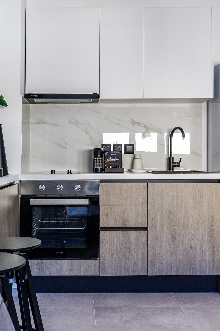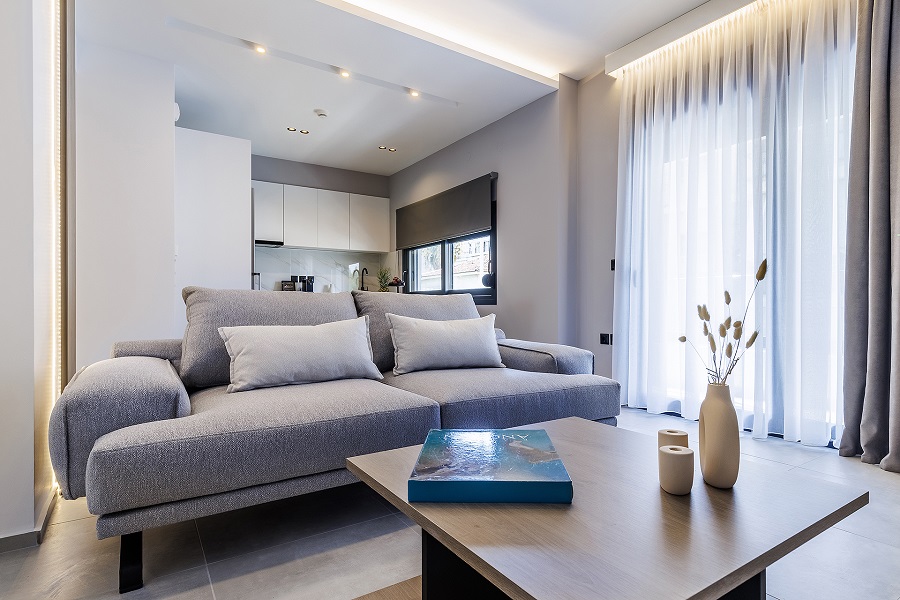 Στο εσωτερικό των κατοικιών κυριαρχεί το λευκό χρώμα σε συνδυασμό με πιο ζεστά υλικά, όπως οι υφές του ξύλου και της τσιμεντοκονίας στο δάπεδο, διαμορφώνοντας έτσι ένα περιβάλλον λιτής, αστικής πολυτέλειας.