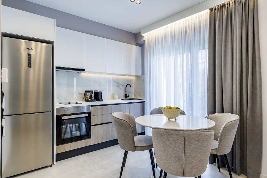 Η ενοποίηση καθιστικού, κουζίνας και τραπεζαρίας είναι κομβικής σημασίας στην εργονομική εκμετάλλευση και λειτουργικότητα. Η οριζόντια ανάπτυξή τους, κατά μήκος της πρόσοψης του κτιρίου, επιτρέπει την οπτική επαφή με το αστικό περιβάλλον και εξασφαλίζει τον επαρκή φυσικό φωτισμό.