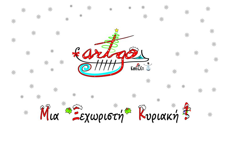 Η Artgo- ΚοινΣΕπ, οι Συνεργάτες και οι Δημιουργοί της, προγραμματίζουν και προσκαλούν την Κυριακή 4 Δεκεμβρίου στην εκδήλωση: “Μια Ξεχωριστή Κυριακή”, που θα γίνει στο Βόλο στο «ΕΝΥΔΡΕΙΟ» , ώστε : να βρεθούμε παρέα με τα αγαπημένα μας πρόσωπα, να ψυχαγωγηθούμε μαζί με τα παιδιά μας, να απολαύσουμε τοπικές παραδοσιακές γεύσεις, να απολαύσουμε όμορφες μελωδίες – «Με ήχο απλό» από τον Τόλη και την Μαρία, να διαλέξουμε δωράκια από τα τραπέζια χειροτεχνών, επαγγελματιών, συνεταιρισμών, να ενισχύσουμε το έργο του συλλόγου “Στηρίζω το παιδί”, με τη δική μας αλληλέγγυα συμβολή στο “δέντρο των ευχών” και στο τραπέζι της ” Κουζίνας Αλληλεγγύης” .