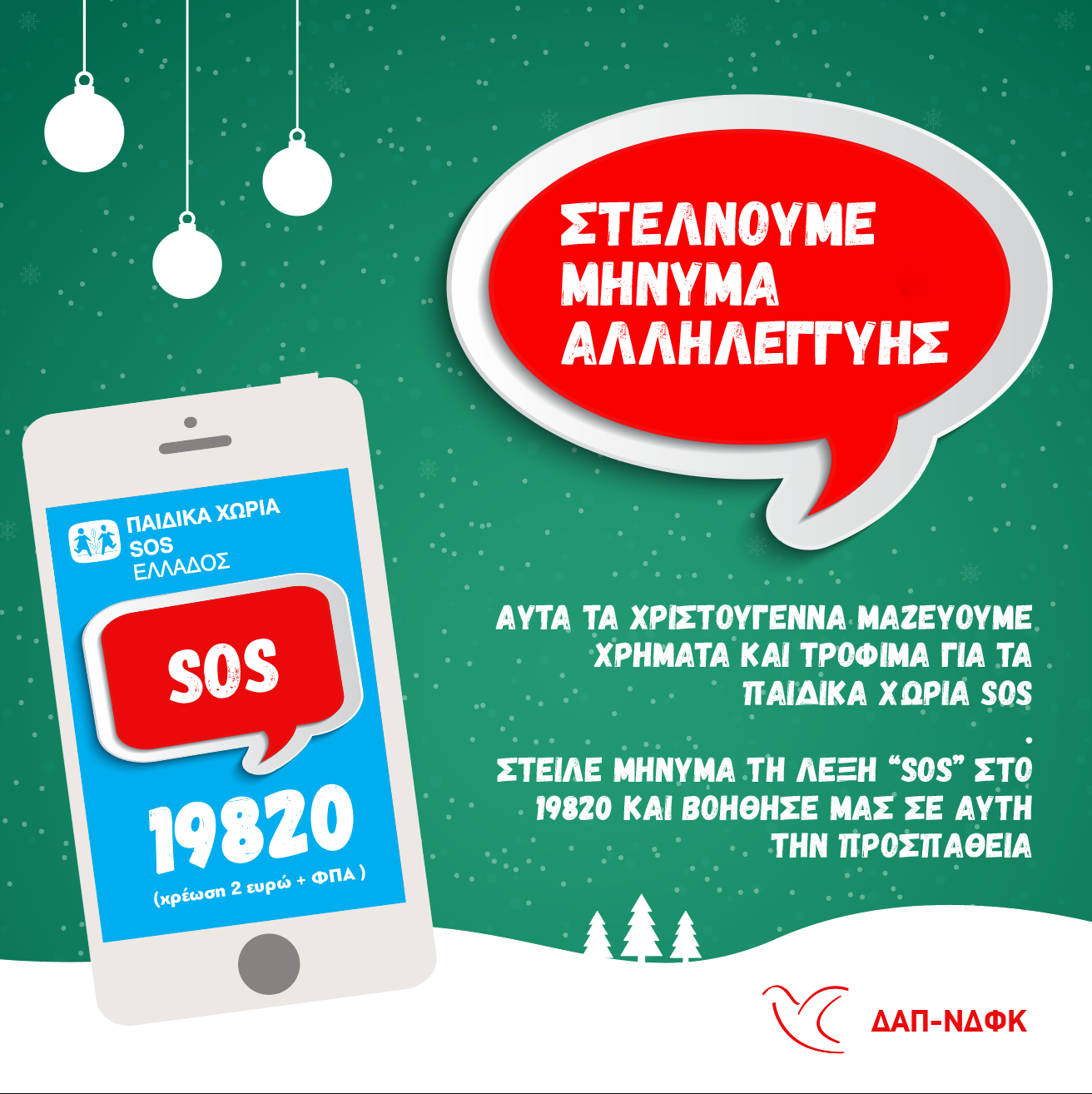 Πιο συγκεκριμένα, από σήμερα Τρίτη έως την επόμενη Τρίτη 20 Δεκεμβρίου, όποιος συμπολίτης μας νιώθει την ανάγκη να δώσει μαζί με εμάς χαμόγελα χαράς στα παιδιά των χωριών SOS, θα μπορεί να το κάνει απλά στέλνοντας ένα γραπτό μήνυμα στον αριθμό 19 820 γράφοντας τη λέξη SOS (κεφαλαία λατινικά).