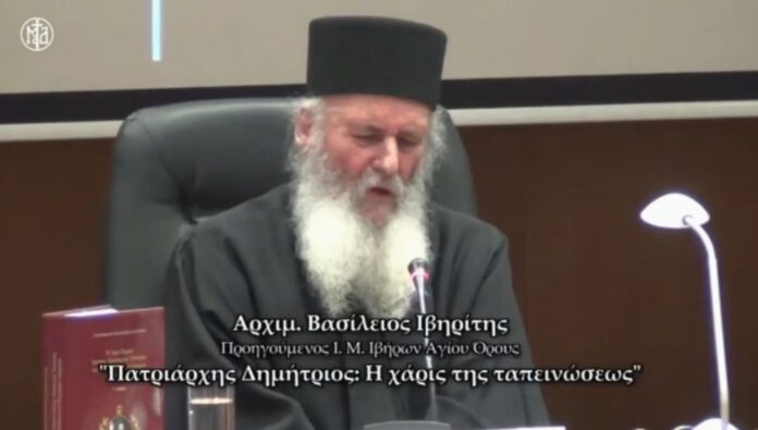 Ο π. Βασίλειος μίλησε με θέμα: «Πατριάρχης Δημήτριος: Η Χάρις της Ταπεινώσεως», ο οποίος μετέφερε τις εμπειρίες του από την ιστορική επίσκεψη του Μακαριστού Πατριάρχου στο Άγιον Όρος το 1990, ενώ επεσήμανε ότι ο αείμνηστος Οικουμενικός Πατριάρχης «μάς έδειξε την χάρη της ενότητος μέσα στην ιστορία, την αποστολή του κόσμου να γίνει Εκκλησία… Αυτό που προσέφερε ο Δημήτριος ήταν η φαύσις της Χάριτος της αιωνιότητος διά της ταπεινώσεως… Δεν ήταν διαπρεπής Θεολόγος, αλλά είχε την Χάρη που ξεπερνά την ιστορία…»