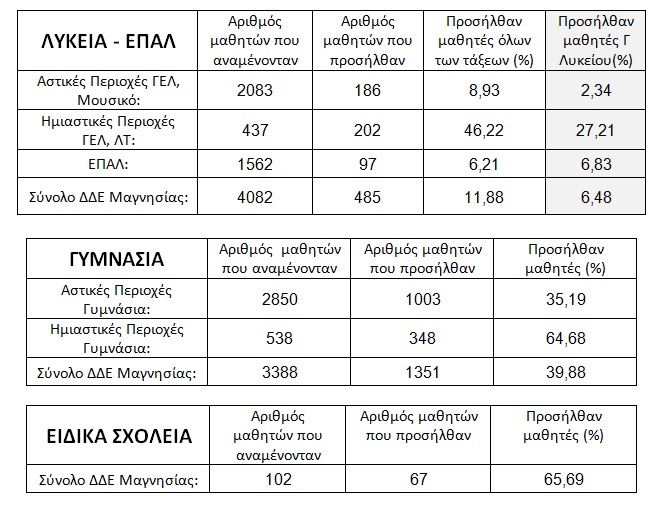 Σύμφωνα με τα στοιχεία της Διεύθυνσης Δευτεροβάθμιας Εκπαίδευσης Μαγνησίας, σήμερα τα ποσοστά συμμετοχής των μαθητών σε Γυμνάσια, Λύκεια, ΕΠΑΛ και Ειδικά Σχολεία είναι τα εξής: