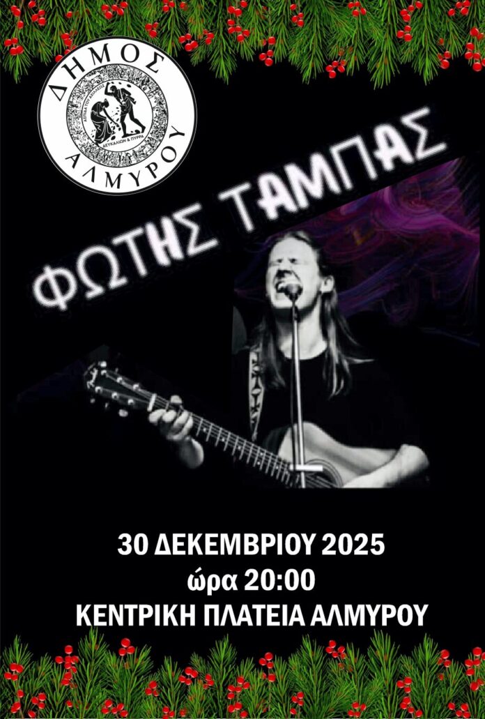 «Λίγο πριν αποχαιρετήσουμε τον χρόνο που φεύγει, οι μουσικές και τα τραγούδια του Φώτη Τάμπα θα ζεστάνουν τη χειμωνιάτικη νύχτα και θα μας οπλίσουν με αισιοδοξία για τη νέα χρονιά! Την Τρίτη 30 Δεκεμβρίου 2025 στην Κεντρική Πλατεία Αλμυρού, στις 8 το βράδυ!» αναφέρεται σε σχετικό κάλεσμα του δήμου.
