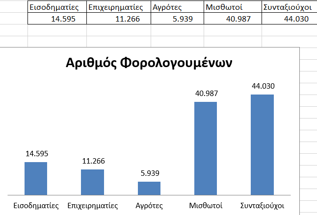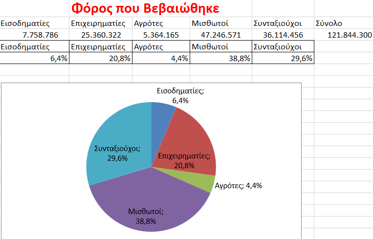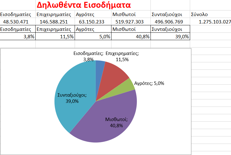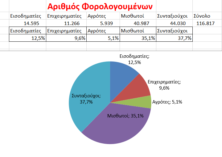 Στα παραπάνω σχηματικά στοιχεία επίσης, εντύπωση προκαλεί ότι η ομάδα των μισθωτών, ενώ πληθυσμιακά αγγίζει το 35,1% η φορολογία που καταβάλει καταλήγει να διαμορφώνει ποσοστό μεγαλύτερο από το πληθυσμιακό, 38,8%.