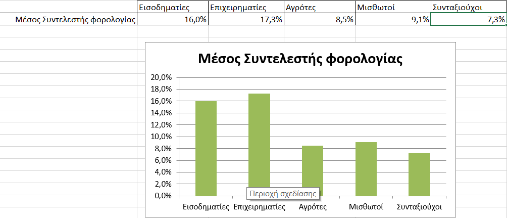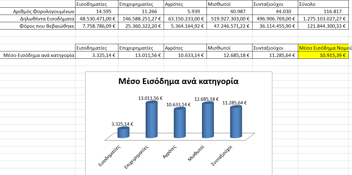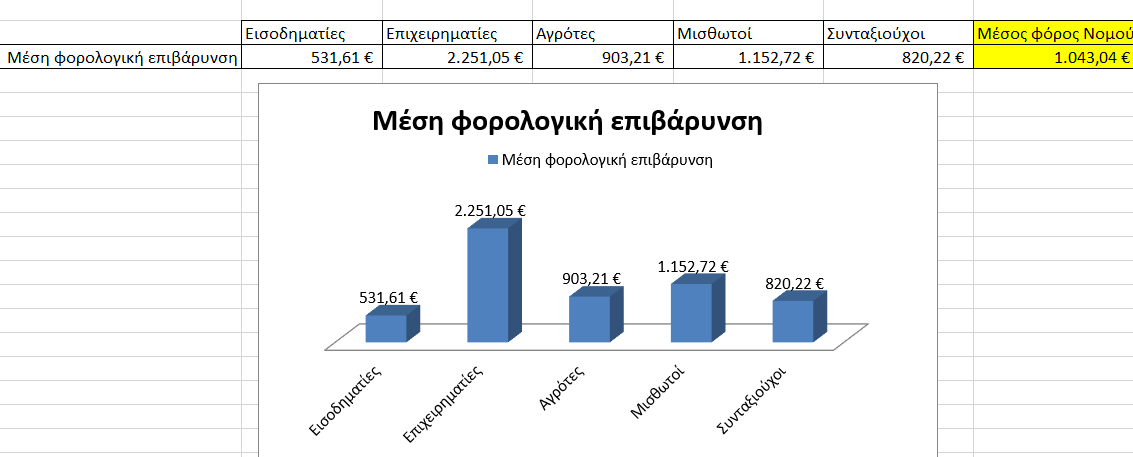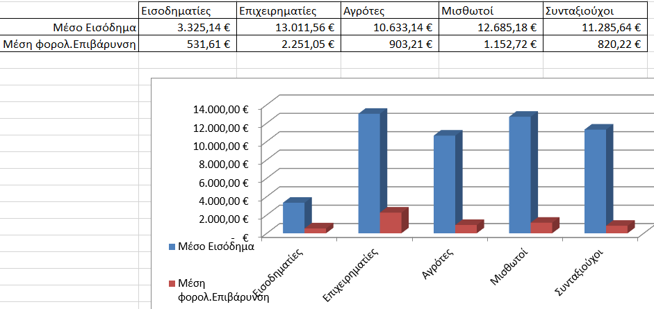 Για να γίνουν κατανοητά τα παραπάνω στοιχεία συγκριτικά, ακολουθεί το παρακάτω διάγραμμα, έχοντας το μέσο εισόδημα και τη μέση φορολογία των πληθυσμιακών ομάδων και τα αντίστοιχα ποσά τους μαζί.