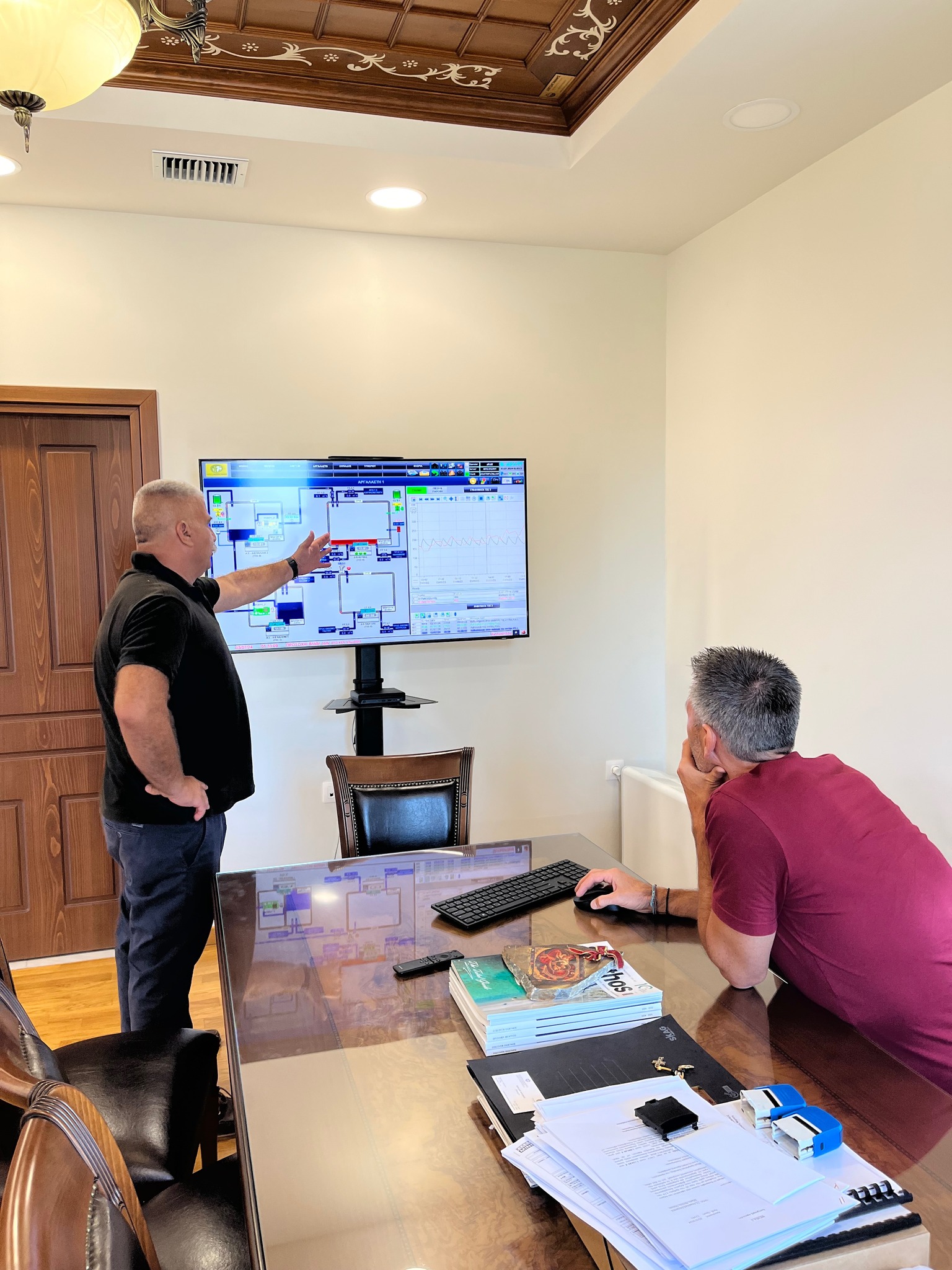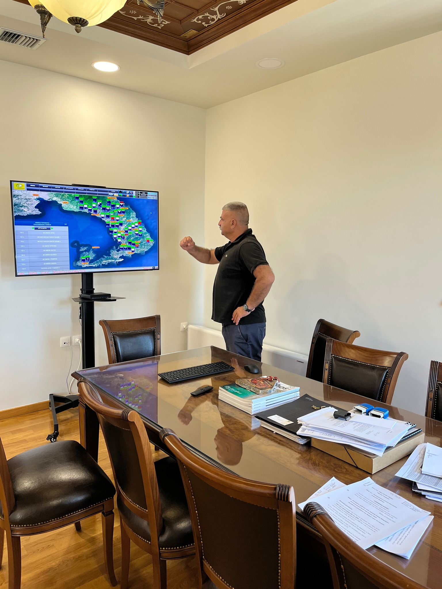 Ο Δήμαρχος Νοτίου Πηλίου Μιχάλης Μιτζικός, μαζί με τον αρμόδιο υπάλληλο της ύδρευσης Γ. Μανούδη, (φωτό) παρακολουθεί σε πραγματικό χρόνο, μέσω του συστήματος τηλεμετρίας και τηλεελέγχου, το δίκτυο ύδρευσης και τη στάθμη των δεξαμενών ύδρευσης.
