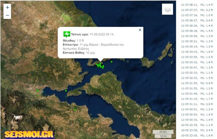 Στις 5.14 σήμερα το πρωί σημειώθηκε μικροσεισμός έντασης 1 Ρίχτερ με επίκεντρο 11 χλμ. Βόρεια – Βορειοανατολικά του Αρτεμισίου Εύβοιας και εστιακό βάθος 10 χλμ.