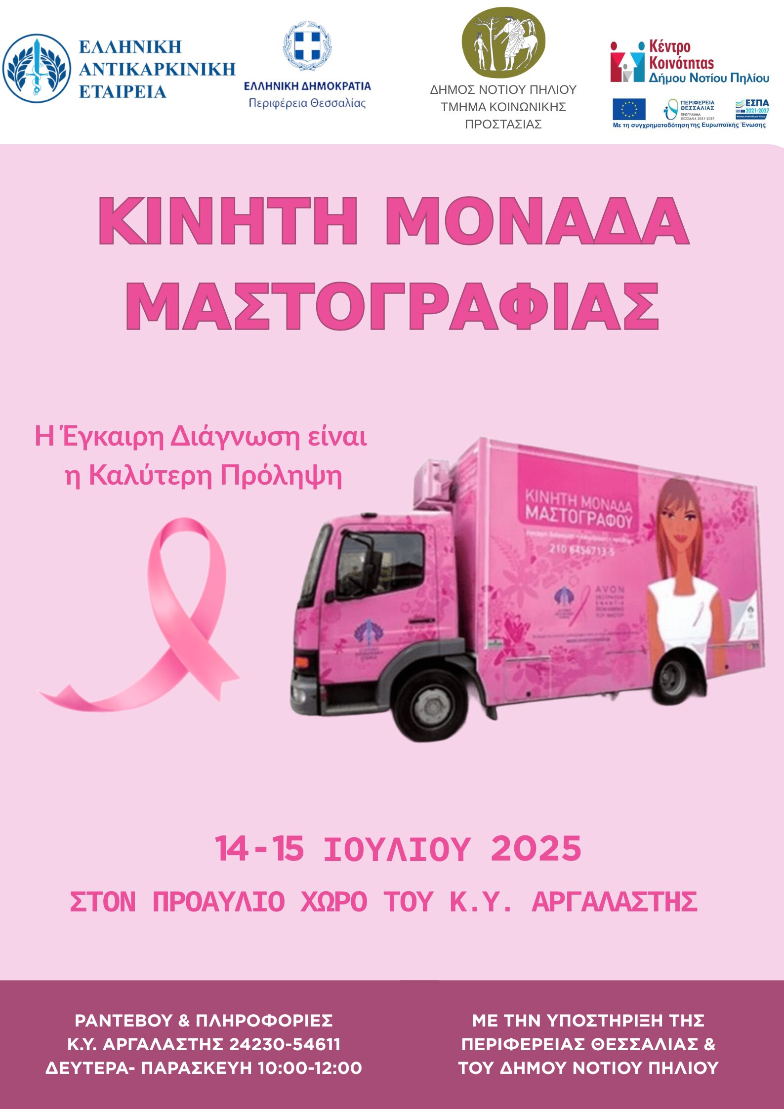 Το Κέντρο Υγείας Αργαλαστής και το Κέντρο Κοινότητας Δήμου Νοτίου Πηλίου, σε συνεργασία με την Ελληνική Αντικαρκινική Εταιρεία, διοργανώνει δράση προληπτικού ελέγχου μαστού.