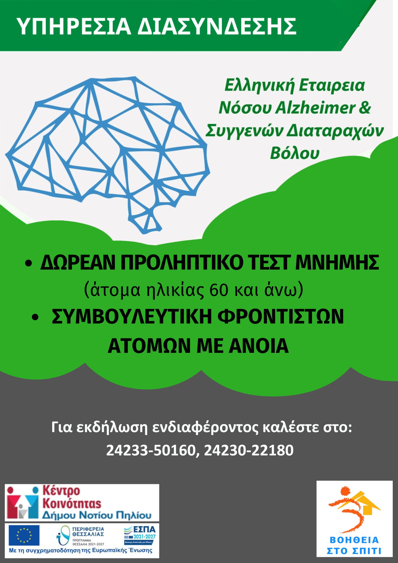 ✔ Δωρεάν τεστ μνήμης σε άτομα ηλικίας 60 ετών και άνω, με στόχο την πρόληψη και έγκαιρη ανίχνευση πιθανών διαταραχών μνήμης.